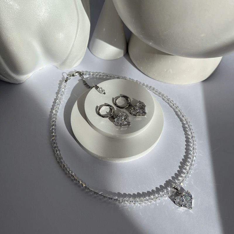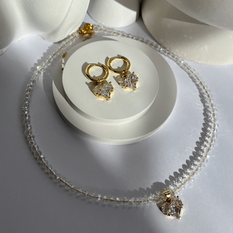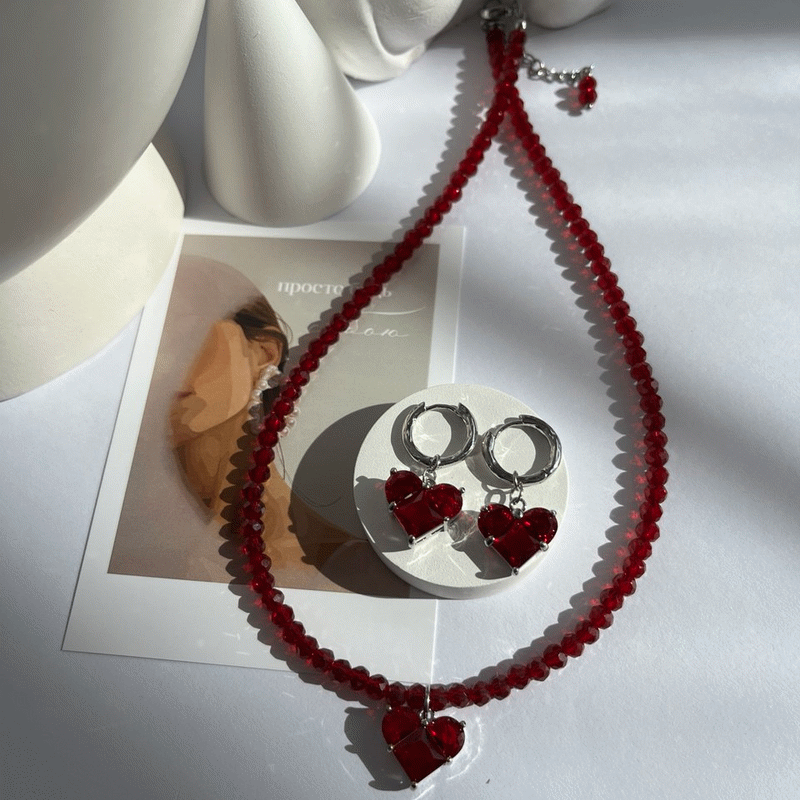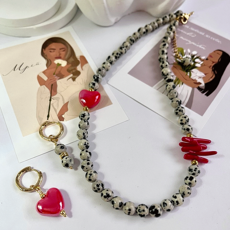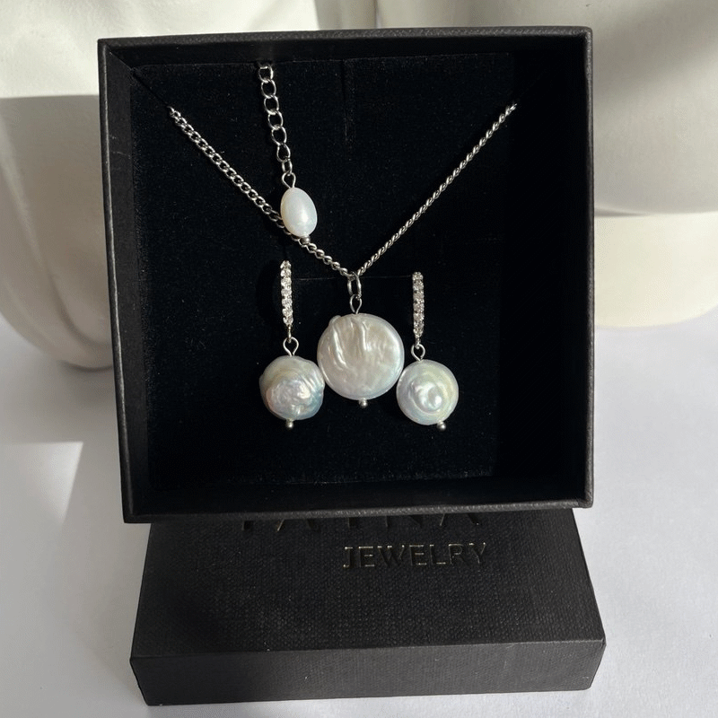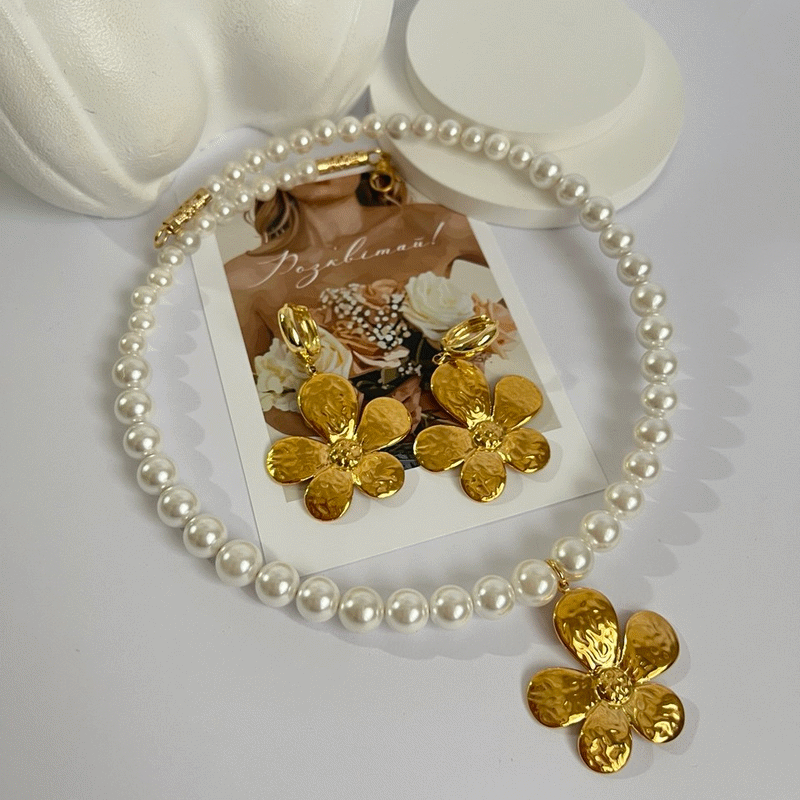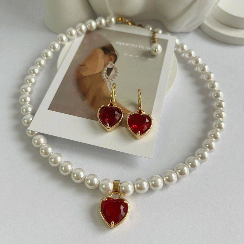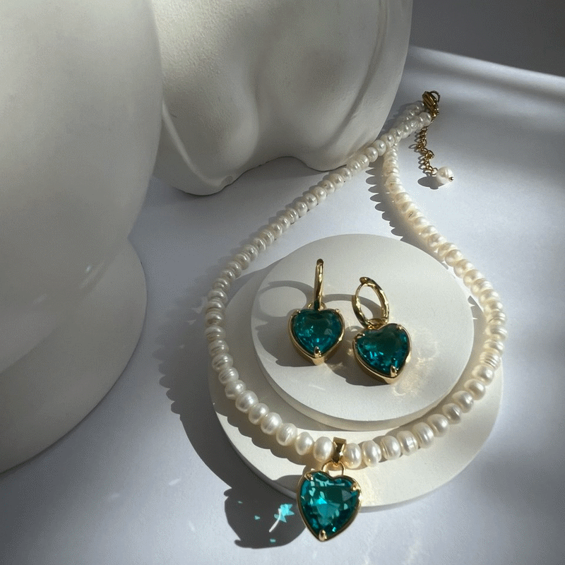 Набір кольє з натуральних перлин та сережки з підвісками серце